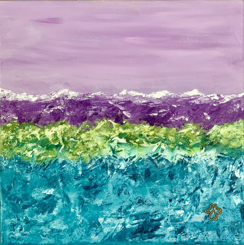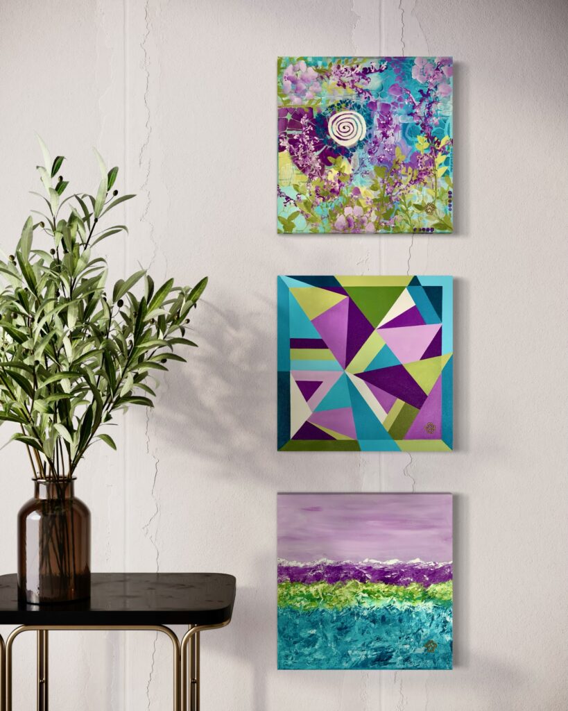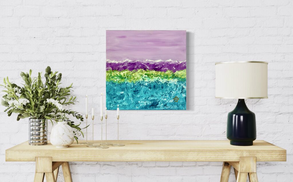 This painting, “Breaths Between Worlds,” can be purchased and displayed beautifully on its own. It is, however, part of a triptych that represents 3 different spiritual journeys that were created with the exact same color palette. Each one of the triptych carries a romantic energy while expressing a different visual language (landscape, geometric and organic.). “Breaths Between Worlds” is an abstract “landscape.” It was created on a gallery wrapped canvas with painted sides that follow the theme of the painting. If you’re interested in all three, look for the name “The Hearts Journey in Three Acts” on my “Available” Artwork page. I wanted the collection of three paintings to evoke a language of the soul. As a triptych they look great displayed either horizontally or vertically. This spiritual trio definitely adds the joy of color and warmth to any room!
