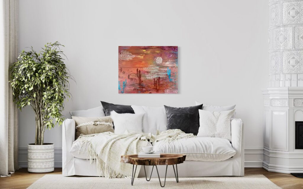 I named this piece “Nevada, Land of Spirit” in order to honor the sacred presence of the Nevada desert; a place where time always feels suspended to me. And where an ancestral presence is embroidered into the soil. It was interesting to work on because that’s not how it started out. I began by wanting to create an abstract piece that incorporated layers and textures using desert colors, but it evolved into something less abstract and more representational … more spiritual.