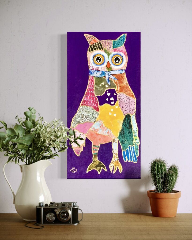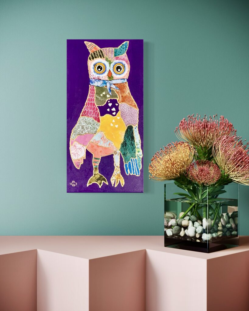 Ralph Waldo Emerson said, βto be yourself in a world that is constantly trying to make you something else is the greatest accomplishment.β I think my fine feathered friend has been successful! He was created with acrylic paint and collage on a gallery wrapped canvas with painted sides .