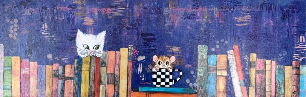 What fun I had creating this whimsical mixed media piece. It’s layers of acrylic paint and collage on a 36″ wide gallery wrapped canvas with painted sides.