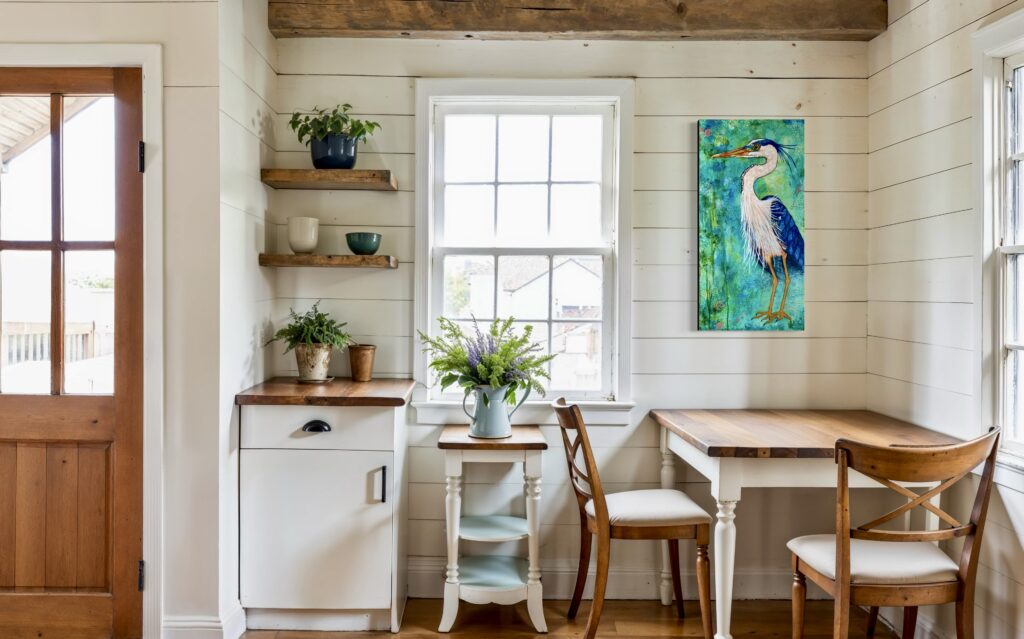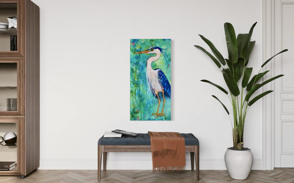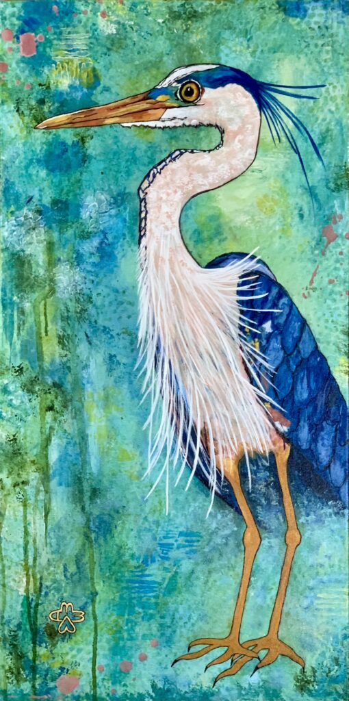 This Great Blue Heron was painted on an 18″ x 36″ gallery wrapped canvas. These herons are very tall and stand 38-54 inches. In flight the bird looks enormous with a six-foot wingspan. In many Native American cultures, the blue heron, particularly the Great Blue Heron, is a powerful symbol of patience, good luck, and prosperity, especially for fishermen. It can also represent self-reliance, balance, and even a connection to the spiritual world. Some tribes view the heron as a guide to finding serenity and a reminder of inner strength. This particular fellow is self-reliant …. and he is sassy!!