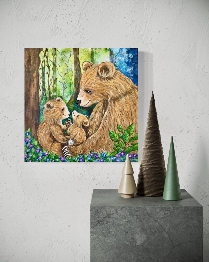 The bond between a mother bear and her cubs is a testament to the remarkable protective nature ingrained in these magnificent creatures. Mother bears tend to be strict, sensitive and attentive towards their cubs, raising them to an age where they can survive on their own. This piece was created with acrylic paint on a 16” x 16” gallery wrapped canvas with painted sides.