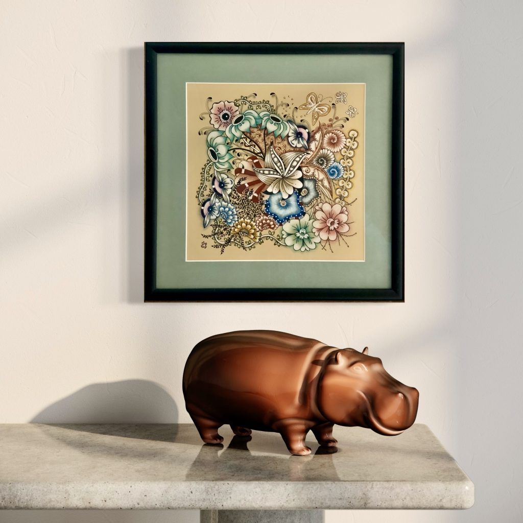 I think of “rhapsody” as a state of overwhelming and pleasurable emotion! Flowers blooming wild in nature can create those emotions within me. The French poet Gerard de Naval has written that “Every flower is a soul blossoming in nature.” What a beautiful thought! This particular piece was created with water color, pastels and color pencils. It’s matted, enclosed in non-glare glass and a black frame.